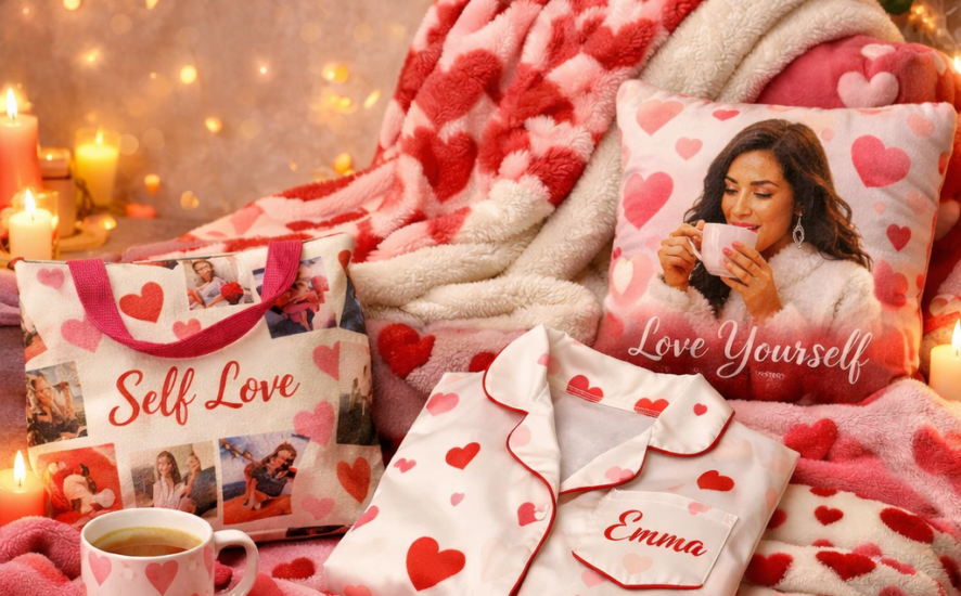 Valentine’s Day can be the perfect excuse for a wellness reset. Amid the chaos of life, taking a moment for self-reflection and nurturing your well-being is essential. Use this time to treat yourself with a cozy evening at home, surrounded by your custom creations. Light some candles, throw on your personalised pyjamas, and envelop yourself in a warm, custom blanket while enjoying your favourite book or film.