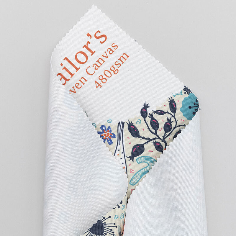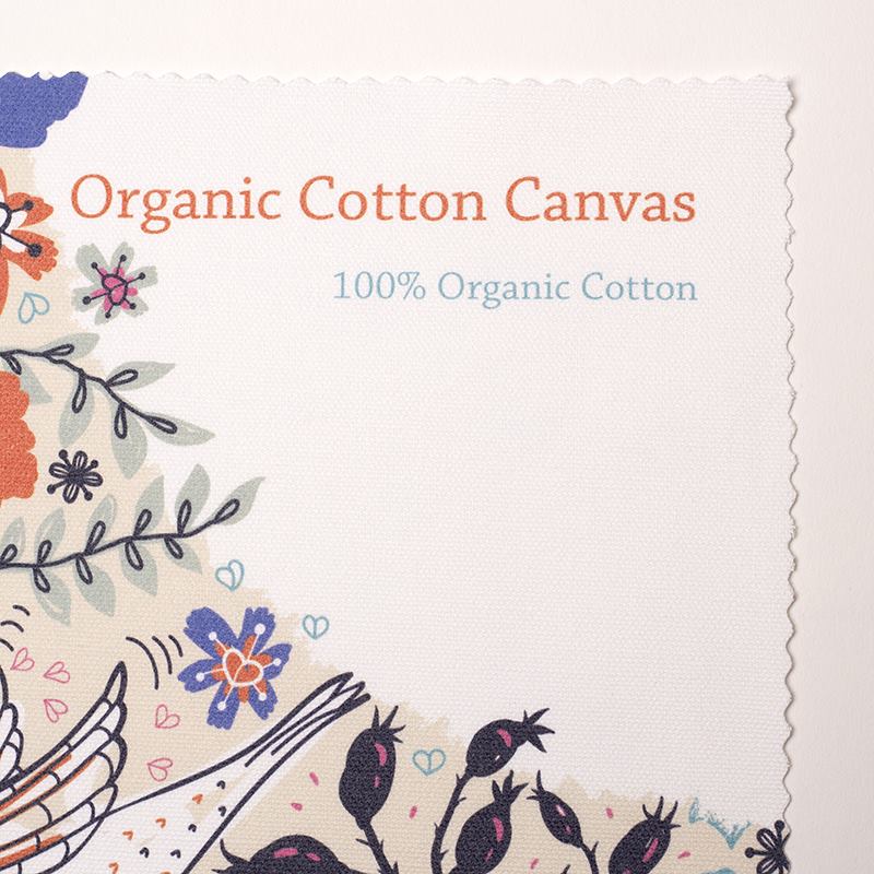 Your design is digitally printed on canvas fabric in vibrant, long-lasting colors. This is done in a variety of ways depending on the fabric, including dye sublimation and pigment printing. We use eco-friendly inks, and you are given a choice of how you would like your fabric finished. It is worth bearing in mind that natural, and in particular, organic fabrics such as our custom organic cotton canvas naturally show subtle asperities that are part of the fibers of the fabric. As such, these elements might slightly show through your designs and will be more visible when light or white designs are printed. These will be less visible with darker colors, patterns or montages. The custom printed organic cotton canvas remains one of the popular choices among our customers.