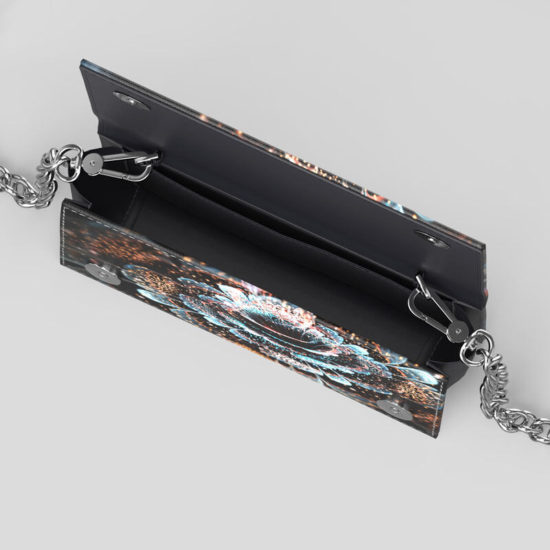 Your evening bag begins with your design. Using our 3D model viewer, you can upload images, photos, and text to create the perfect virtual evening bag. Once you're happy, our industry-leading printers will print onto Nappa leather, before our team of skilled leatherworkers cut, shape, and stitch your bag into life by hand, using the leather option, thread, and metal color of your choice. The detachable leather strap, the sides, and the base of your bag will always be made from smooth black Nappa leather to provide a timeless backdrop to your design. The strap, as well as the black areas of the main bag, are included in our premium service: expertly hand-painted edges. The finishing touch to your sleek evening design.