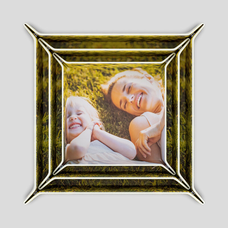 When you're designing your personalized trinket dish, keep in mind that the image will be creased when the sides are folded up. If you're using a photo of a person or animal, we recommend keeping their face in the middle of the tray away from the folds. You'll be able to see the folds marked in the design interface so that you can avoid them.