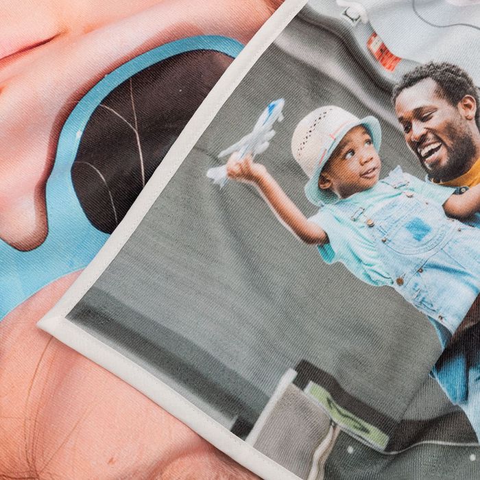 Create your own custom beach towels with a picture or even a montage. The simplest way to create your own beach towel is to create one all-over print. They look great, especially on the oversized custom photo beach towels, and so do photo collages. This popular choice makes it a great personalized photo gift. Or be creative and print your face all over the custom-printed beach towels and preview the look on our design interface. For one, your customized beach towels will be super-easy to spot on a crowded beach, plus a beaming selfie or group portrait will be a great memory to have with you on the go. Photo towels are as fun to handcraft as they are to give and use. Try out our preview design tools to see what your personalized photo beach towels could look like.