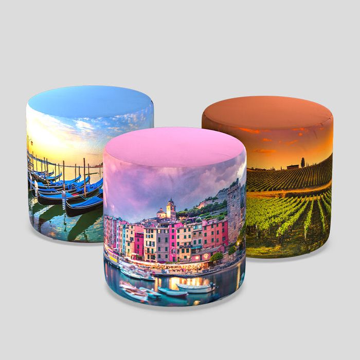 Turn your personalized pouf into a mobile mini-gallery in your home. The square pouf has five areas that you can customize, and you can design multiple to arrange into one big ottoman featuring one image or pattern. Meanwhile, the round pouf is the perfect multi-purpose standalone piece. It offers two printable areas and is the perfect bit of extra seating.