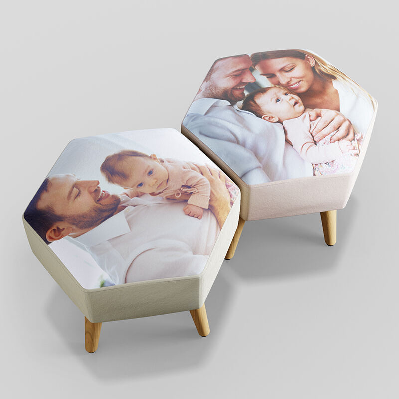 Once you have chosen the shape for your bespoke ottoman footstool, choose one design that will be printed on the top and one design printed on the sides. For the round footstool, one design will be printed on top and one long strip will be wrapped around the side of the bespoke vanity stool. Note that for the square and hexagon footstool you'll have to design one of the side panels first which will be repeated on each of the other sides. In total that would be 6 sides on the hexagon footstool and 4 sides on the square footstool.