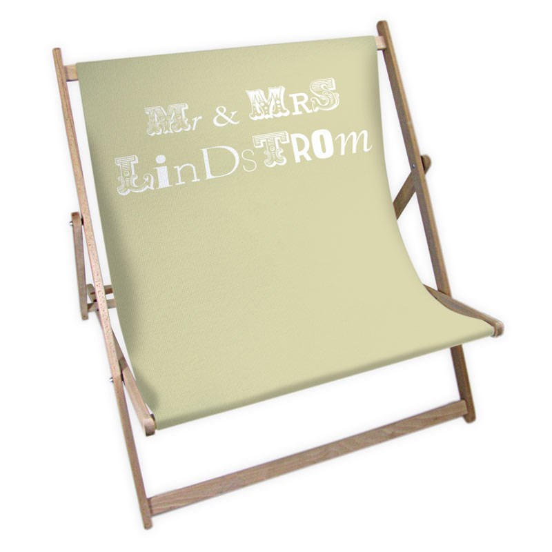 You select the text in our online design tool and our technicians will print this using modern digital printing techniques directly onto the woven canvas. The eco-friendly inks penetrate deep into the fibers of the material resulting in a long-lasting permanent print that doesn't have a surface texture. This is then cut to size by our craftsmen before being stitched by our expert seamstresses. Once the sling of the Mr and Mrs deckchair is ready, it is attached to the deckchair frame, before being quality checked and sent out.
