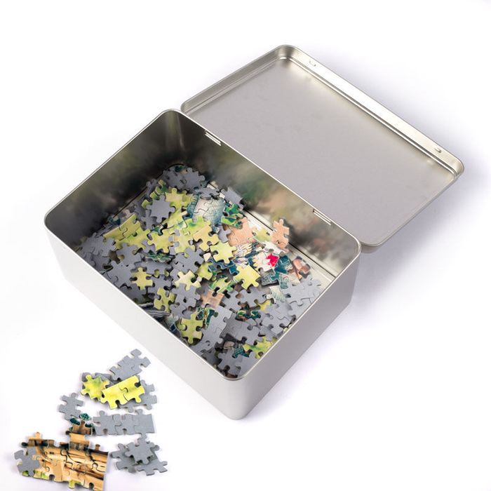 Once you have finished your custom 500 piece puzzle, you can choose between a plain or printed tin with the same design or a sustainable unprinted satin bag.