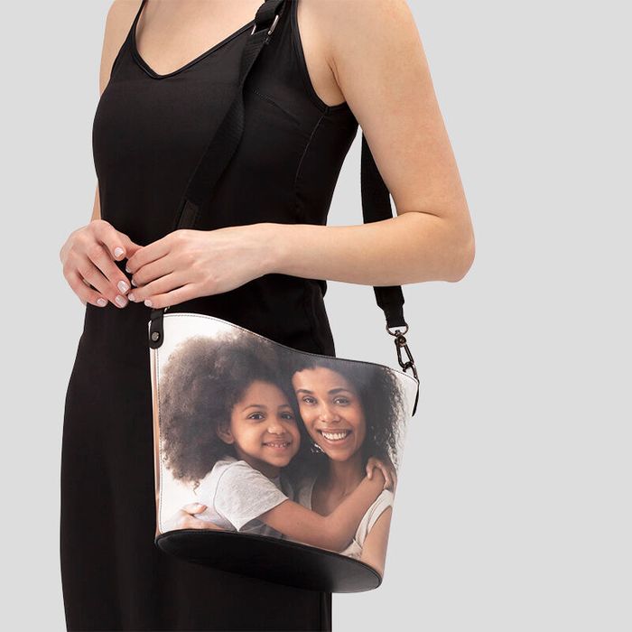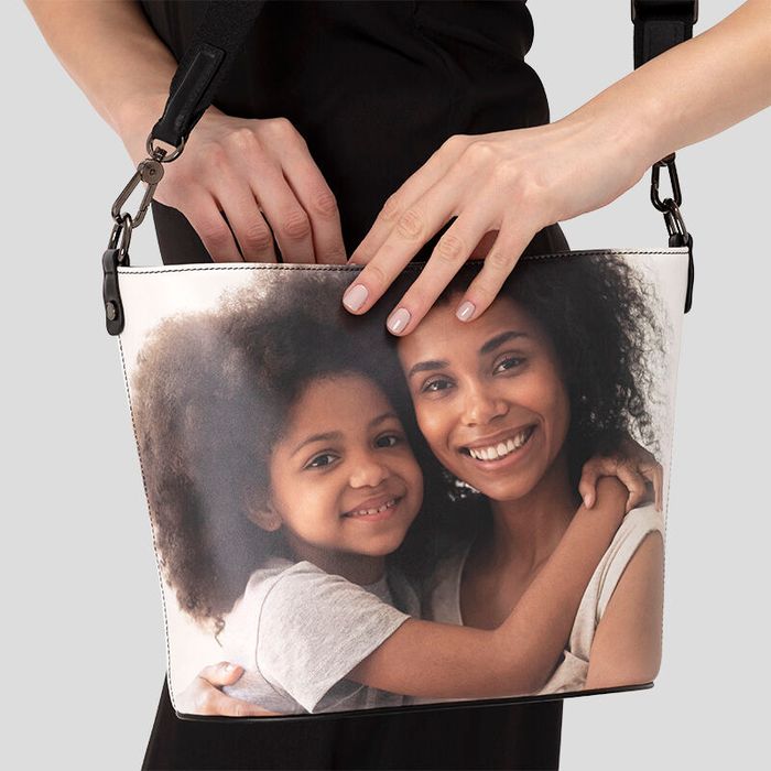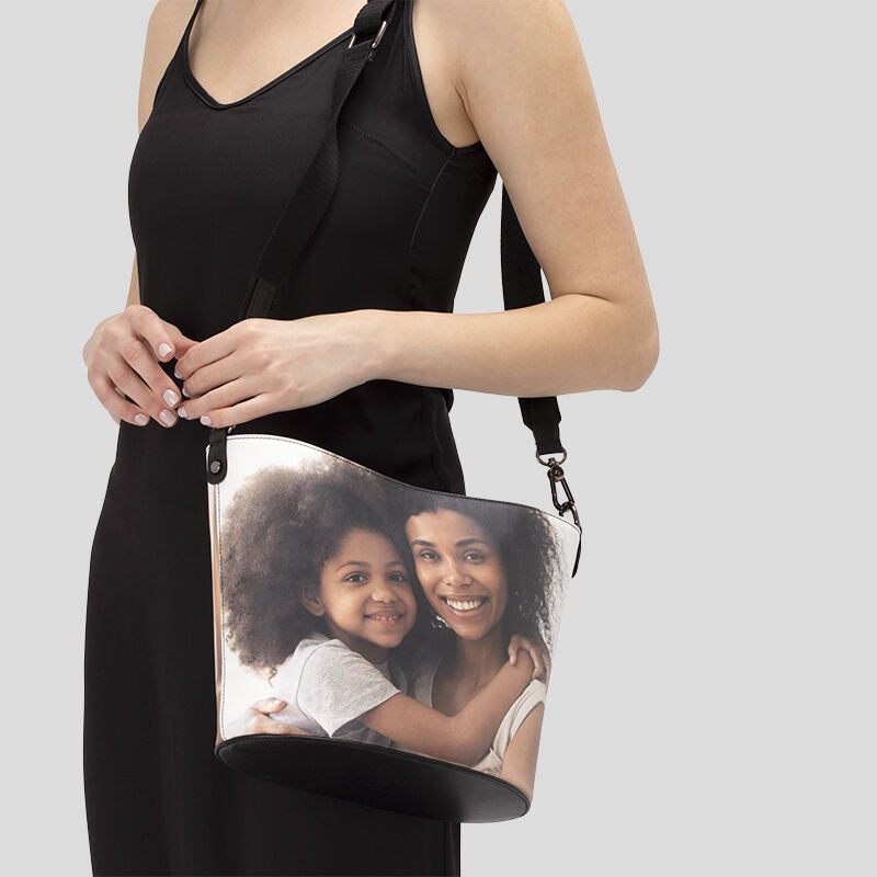 Photos and patterns work really well on your personalized leather bucket tote as there are 2 large design panels. We recommend that when you design your own shoulder bucket bag that you keep important details of your photo centralized as the design panel wraps around the sides of the bag. We also recommend that you pay close attention to the preview as when the bag is closed there is a curved shape that is created by the joining together of the tabs.