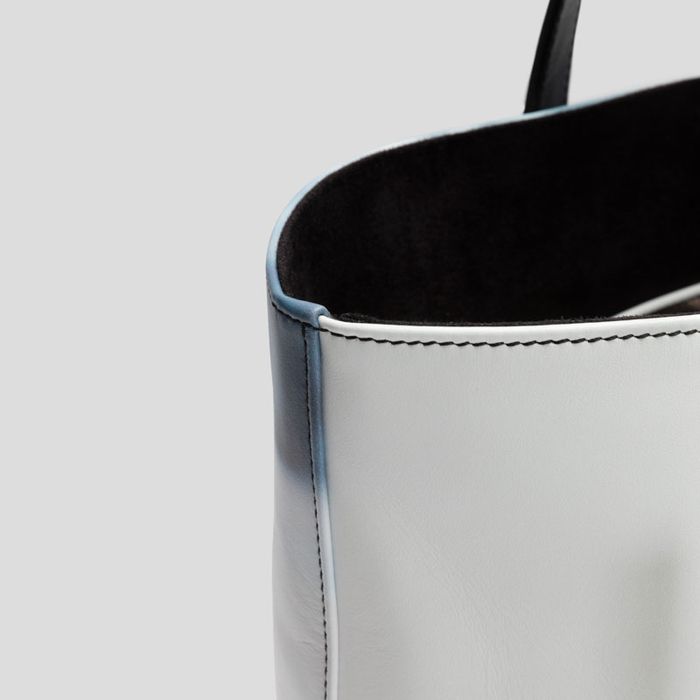 Your Kika tote is crafted on-site in our studio with no minimum order amount. A specialist prints your artwork directly onto soft Nappa leather using techniques developed for long-lasting color. After printing, the panels are cut, piped in leather around the base, and stitched together by our experienced team.