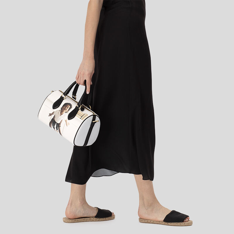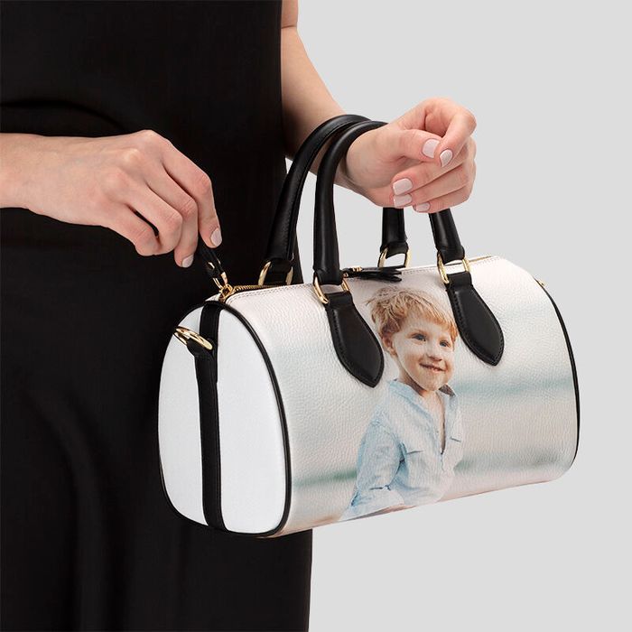 Your custom barrel bags are handmade to order in our studio by a team of experts. Once we receive the designs for your personalized small duffle bag, the leather is carefully printed with your photos. Then our team of leatherworkers will cut, shape, and stitch your bag from scratch. Each piece of leather will be stitched together one by one. We finish it off with black Suede Vision lining and polishing the metals to make sure it is completed to a high standard. Once we are happy and know that you will be too, we will send your bag out for delivery.
