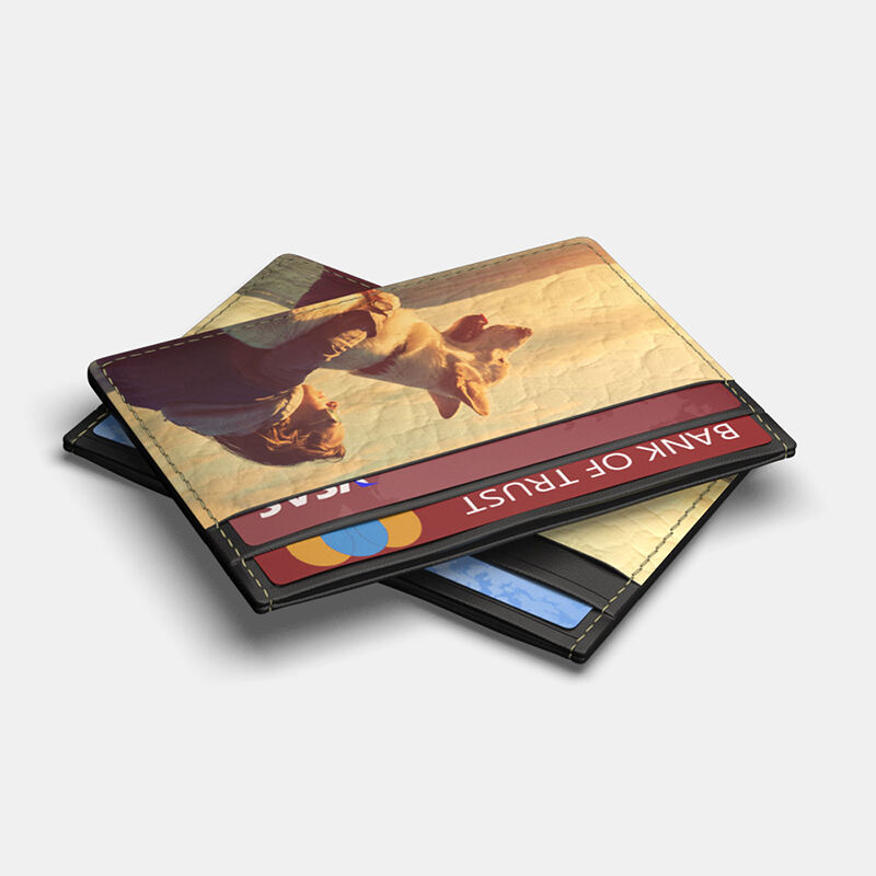 If you want a symmetrical custom photo card holder, simply upload your image to one side, click to design the other side but press 'Copy Side'. This will transfer the same image as it is onto the other side, so go onto Effects and select 'Mirrored Design'. Drag your photo across until the mirrored version comes into view and position accordingly. There are two pockets on either side as well as a central section. The pocketed section is black and sits at the top of your leather card case, above the print. Be mindful of this when creating your design, especially if you are using photos with faces, as you don't want important features like eyes being cropped out.