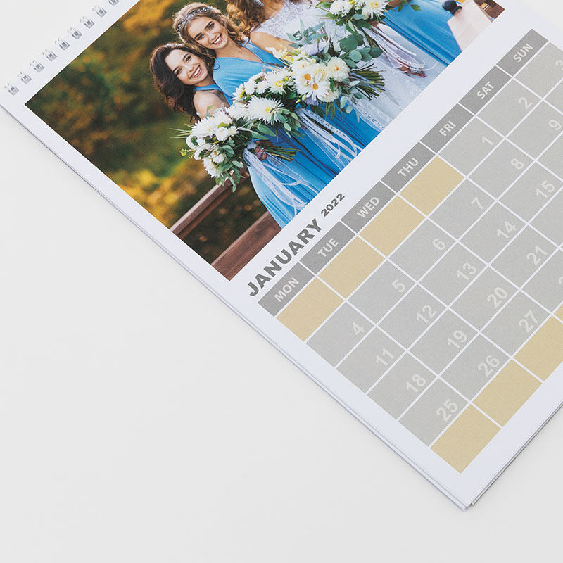Your photos are printed onto beautiful 4.72oz silky art paper, which gives exceptional print quality and vibrancy. Choose from A4 or A3 size calendars and upload a different photo - or maybe even a photo montage - for every month. Your calendar is bound with a white metal wire binder, complete with hanging hook, making it quick and easy to display. You can start your calendar from any month you wish, making this the most personalized wall calendar available. Our specialist printing method produces crystal clear detailing, so even fine lines are depicted beautifully. Upload single photos, or have fun creating a montage, using our photo montage tool. Stock up on photo wall calendars for unique Christmas gifts.