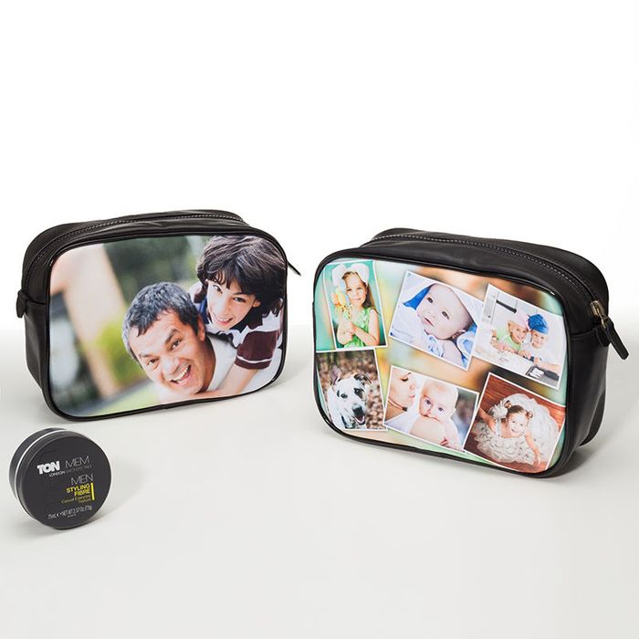 Pick out your favorite photo and put it on this stylish toiletry bag to create a thoughtful gift. Celebrating years together? Why not give him a personalized mens toiletry bag featuring a photo from a special day together. Ideal for anniversary gifts (cotton canvas or leather themes). You can even have a couple's matching custom ladies cosmetics and men's toiletry bags.