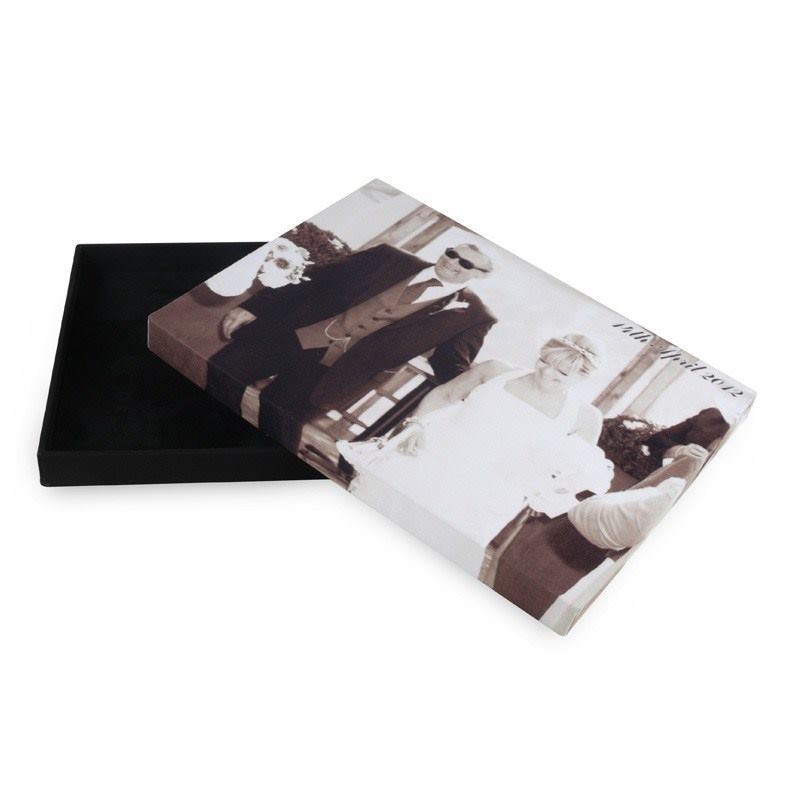If you have a precious book, or have made your own photography book, you will need something special to store it in. We make photo book boxes for picture books. They come in three different sizes (A5, A4 & A3), and are made from FSC certified wood. Book boxes make for safe storage of precious memories. Create a photo book presentation box to match the book you just created. Use our photo upload design tools to design your own box for your photo book. Make photo book boxes especially for your photo books. We personalize the cover of your photo book box to suit the item that is going in it. For example, if it's a wedding photo book, we can help you create a photo book gift box with a photo from your wedding on top.