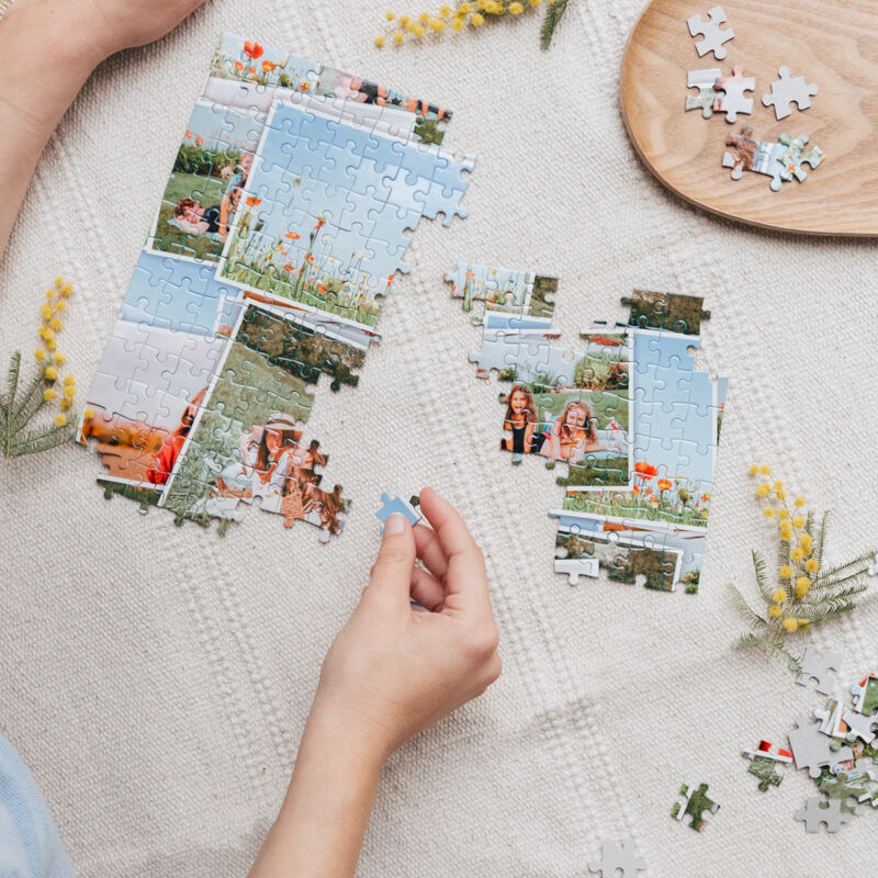 Want to create a jigsaw puzzle with a photo collage? There's no need to rearrange your photos manually because our design system automatically creates the collage in various different styles. Choose a plain background with your photos spread out or design your own photo collage jigsaw with one of your photos faded in the background for an artistic look. There's also a heart collage where your photos are arranged into a heart shape - ideal for romantic gifts. The 'scattered' style fills the jigsaw edge-to-edge with photos, and the design system will let you know if any photos are repeated. Whatever style you choose, your jigsaw puzzle photo collage will become a new favorite at family game nights.